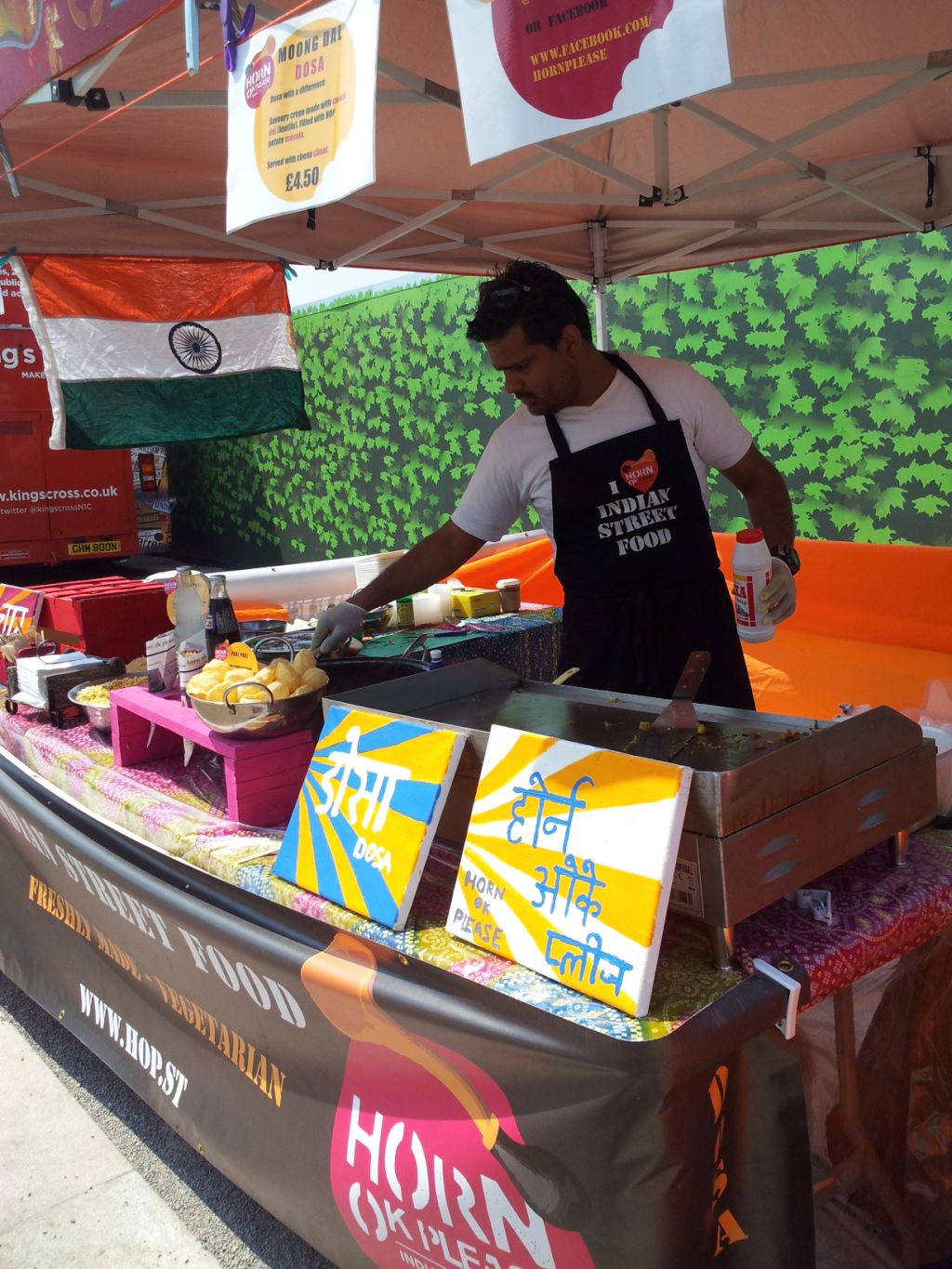 Two weeknds in April saw us pitch up at Southbank behind the Royal Festival Hall for the ‘Taste of India’ Festival in conjunction with events happening at the Festival Hall.  This was organised by the people behind the RealFoodFest. It was nice to stand out from the crowd of traders who were presenting the usual curry, rice and naan. Moong Dhal dosa and Samosa Chaat were a hit and toward the end of each day it was all about pani puri and bhel puri – was like being back on the streets of India. As a first the organisers also asked if we can do a demo on street food…my first but I think it went well.